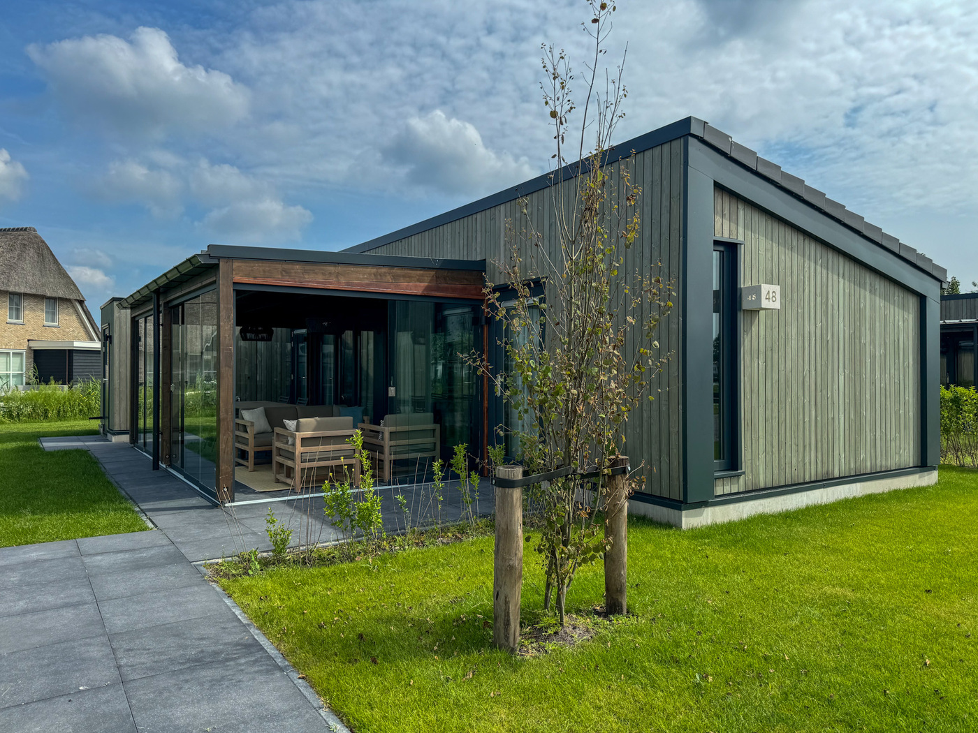 Wat deze lodge echt bijzonder maakt, is de tuinkamer: een stijlvolle overkapping met glazen schuifwanden waar je beschut kunt zitten, ook bij wat frisser weer. Zet de glazen wand open op een warme zomerdag of geniet van een kop koffie in de herfst met uitzicht op het kabbelende water. Je hoort alleen het zachte klotsen van de golven en het geroep van de watervogels — heerlijk toch? De ligplaats ligt direct voor de deur (nummer 23), zodat je spontaan een boottocht kunt maken over het Tjeukemeer. Neem je fietsen mee, want de omgeving is prachtig om te verkennen via de Friese merenroute of richting Lemmer.