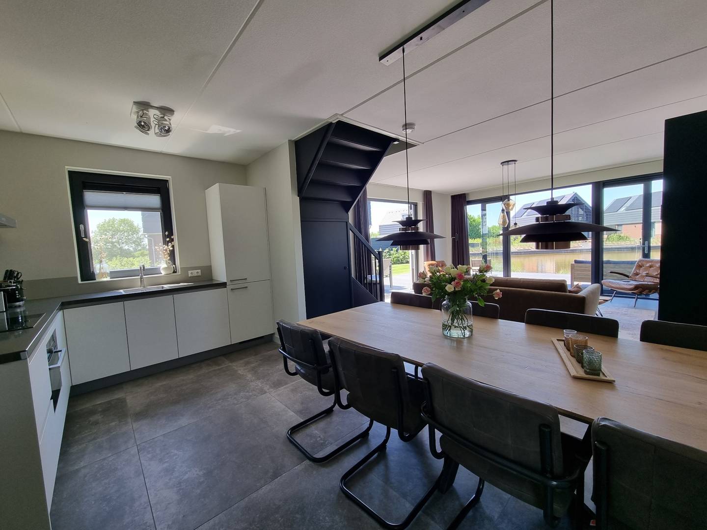 Buiten geniet je van een ruime tuin met terras aan het water, ingericht met zowel een lounge-set als een eettafel. Je hebt een terrasvlonder, zwemtrap en eigen aanlegsteiger, waardoor je direct het Slotermeer op kunt. De buitendouche is een fijne extra voor zomerse dagen. Tip: neem fietsen mee om de omgeving te ontdekken, want de paden langs het water en door de Friese dorpen zijn prachtig.