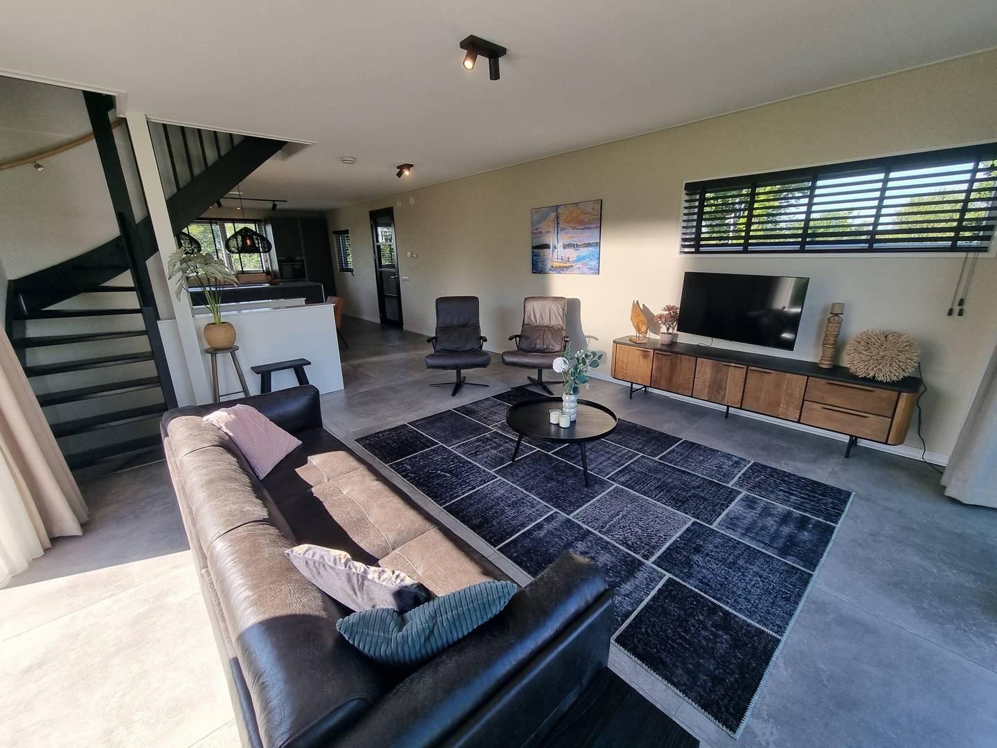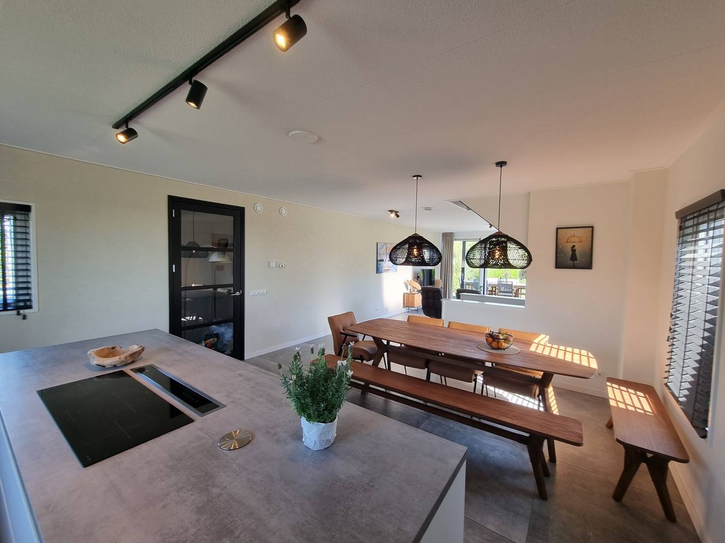 De begane grond is één grote, lichte leefruimte met een comfortabele zithoek en Smart TV, een lange eettafel en een open keuken met kookeiland. Je kookt op inductie en hebt de beschikking over een vaatwasser, Quooker, Nespresso, multifunctionele oven/magnetron, koelkast en vriezer. Op de eerste verdieping vind je twee slaapkamers (hoofdslaapkamer met tweepersoons boxspring en een slaapkamer met tweepersoonsbed) en een ruime badkamer met ligbad, inloopdouche, wastafel en toilet. In het souterrain liggen nog twee slaapkamers (één met tweepersoons boxspring, één met twee losse bedden) plus een tweede badkamer met douche en toilet. Handig: in totaal zijn er drie toiletten, en je hebt een wasmachine en droger. Buiten wachten het terras met meubilair, de zwemtrap, buitendouche en een toegankelijke fietsenberging. Vanaf de woonkamer loop je via openslaande deuren zo de vlonder op – hoe relaxt is dat?