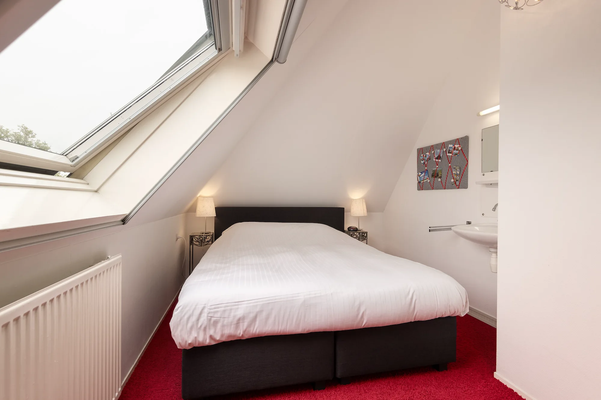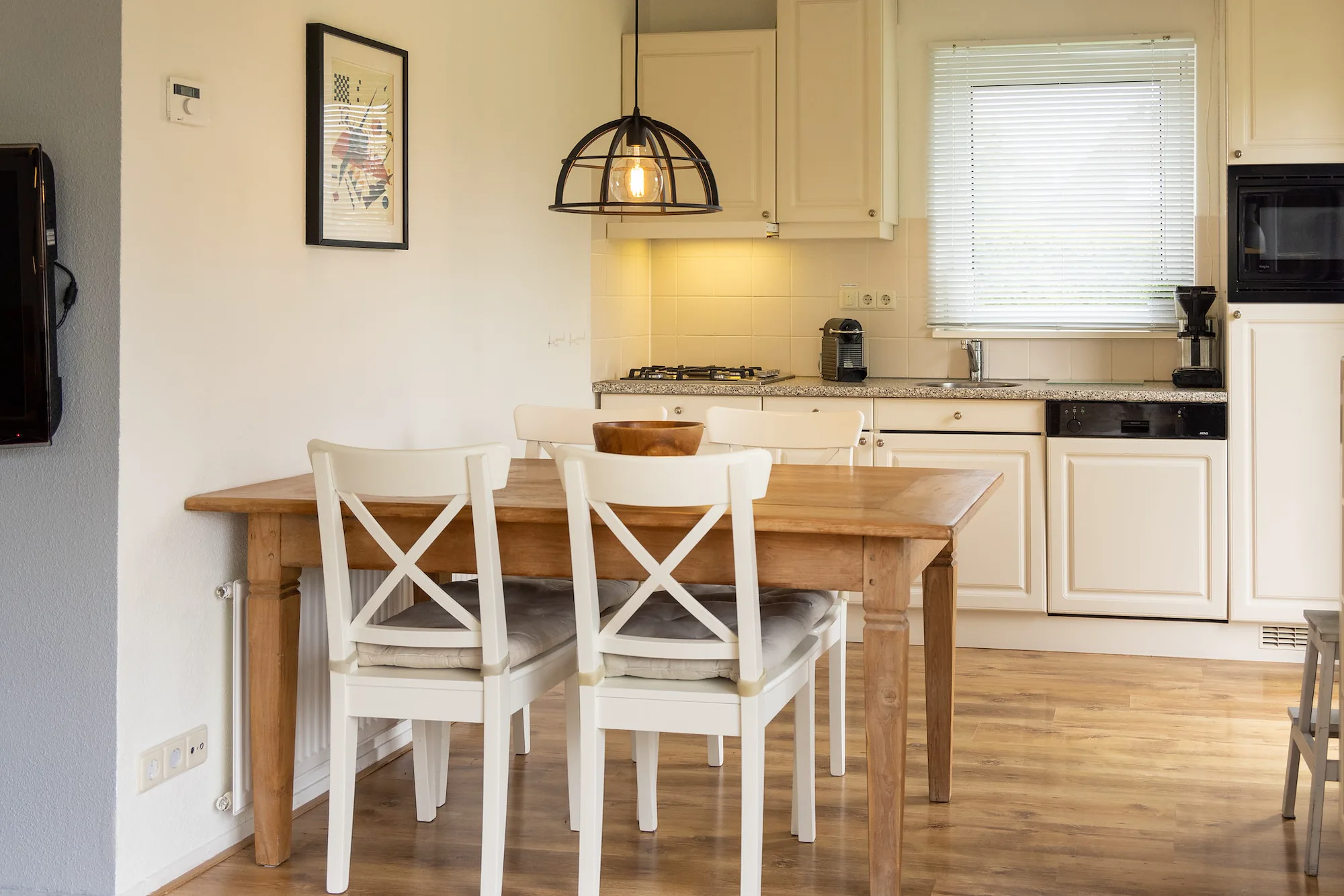Als je hier verblijft, geniet je van alle gemakken die je nodig hebt. De woonkamer is gezellig ingericht met een zithoek en televisie, en grenst aan de open keuken met eethoek. In de keuken vind je onder andere een koelkast met vriesvak, magnetron, waterkoker, filterkoffiezetapparaat en vaatwasser – handig als je zelf wilt koken. Op de begane grond bevindt zich de badkamer met douche en toilet. Boven zijn twee slaapkamers: één met twee eenpersoonsbedden en één met een eenpersoonsbed. In sommige bungalows vind je beneden ook een bedstee – leuk voor kinderen of extra logees!