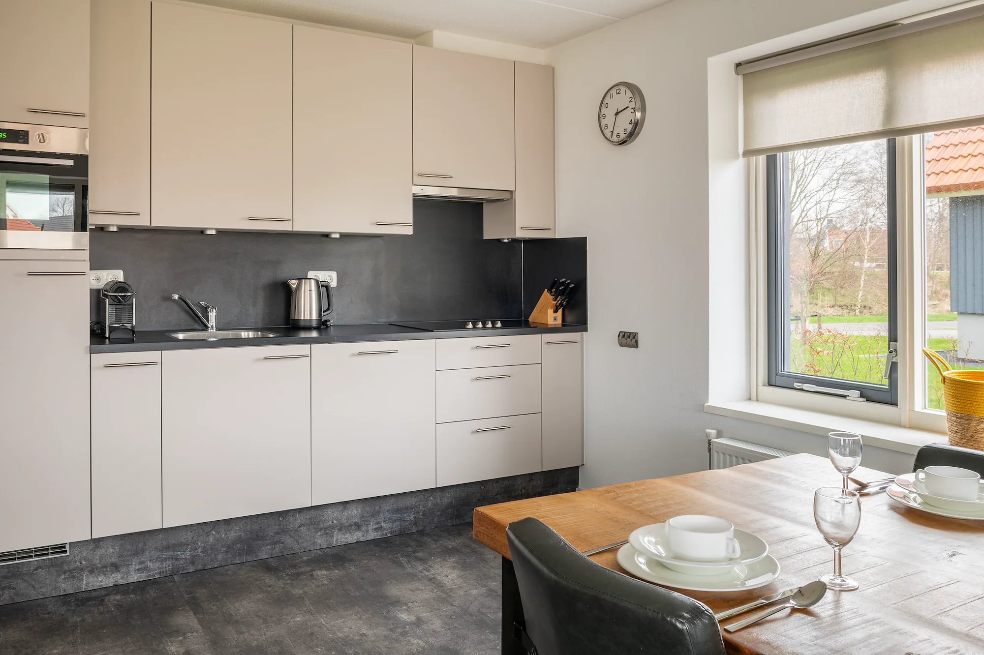 Als je verblijft in Watervilla Brasem, geniet je van alle gemakken van thuis – maar dan met het water letterlijk aan je voeten. De woonkamer is modern ingericht met een gezellige zithoek en een eethoek waar je met z’n allen kunt tafelen. De open keuken is goed uitgerust met een combi-oven, vaatwasser en koffiezetapparaat. Op de begane grond vind je een slaapkamer met twee boxsprings en een badkamer met douche en toilet, ideaal als iemand slecht ter been is. Boven zijn er nog twee slaapkamers en een tweede badkamer. Alles voelt ruim, licht en comfortabel aan, precies wat je zoekt tijdens een ontspannen vakantie in Friesland.